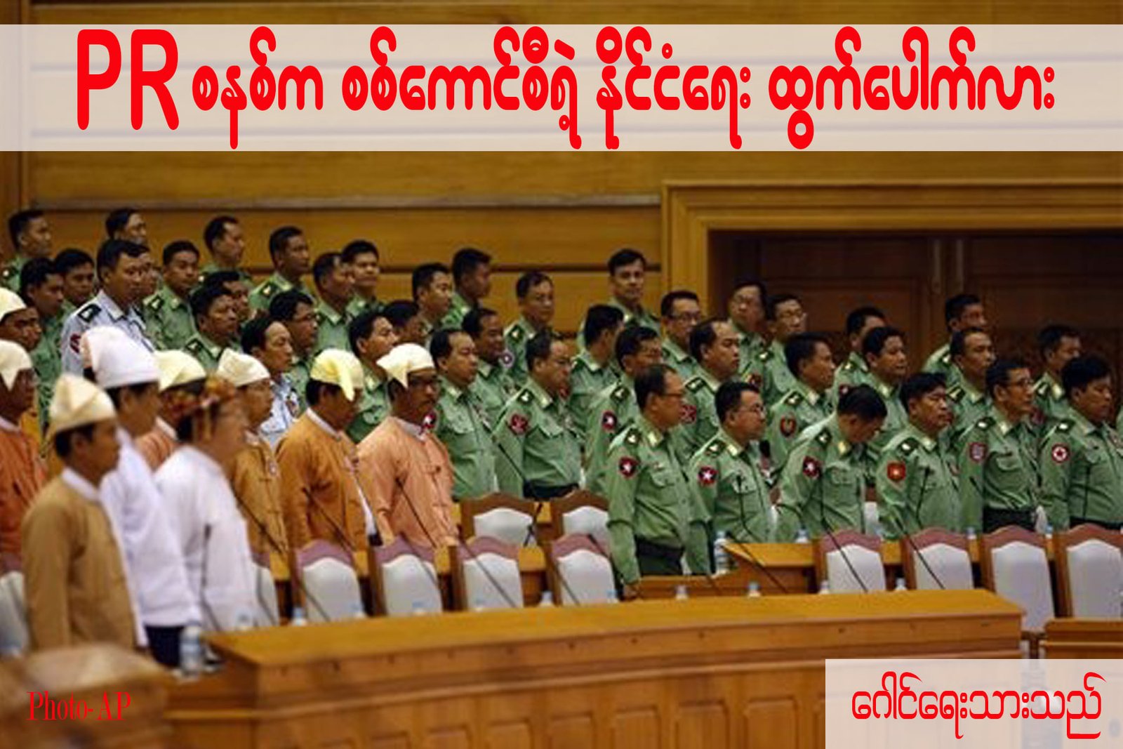 PR စနစ်နှင့် ပတ်သက်ပြီး မြန်မာ့နိုင်ငံရေး လောကသားတို့ကြားတွင် မတူညီသည့် သဘောထား တို့ကိုလည်းတွေ့နေရသည်။ ယင်းမှာလည်း PR စနစ် မှာလည်း တပ်မတော်ဘက်က ၂၅ ရာခိုင်နှုန်း ယူထားသည့် ကိစ္စရှိကြောင့် ပြည်သူလူထုအတွက်ကတော့ အကျိုးမရှိနိုင်ဟုလည်း သုံးသပ်နေကြသည်။