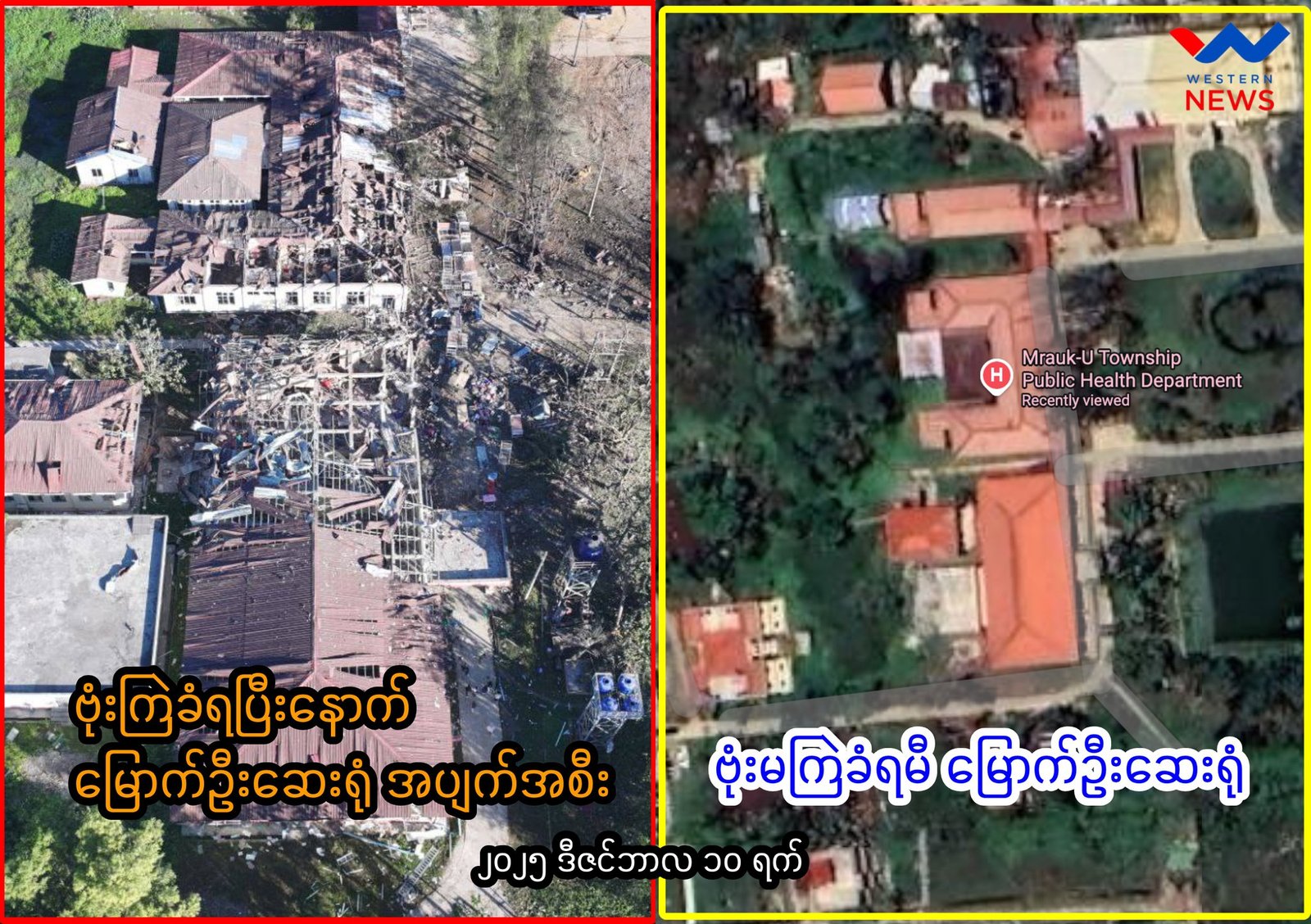 ယမန်နေ့ ဒီဇင်ဘာလ ၁၀ ရက်နေ့ ညတွင် စစ်ကောင်စီ ဗုံးကြဲမှုကြောင့် မြောက်ဦးပြည်သူ့ဆေးရုံကြီး အားလုံးနီးပါး ထိခိုက်ပျက်စီးသွားကြောင်း သိရသည်။