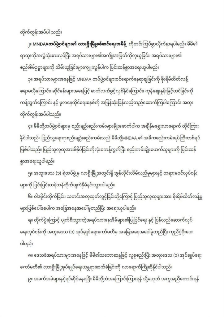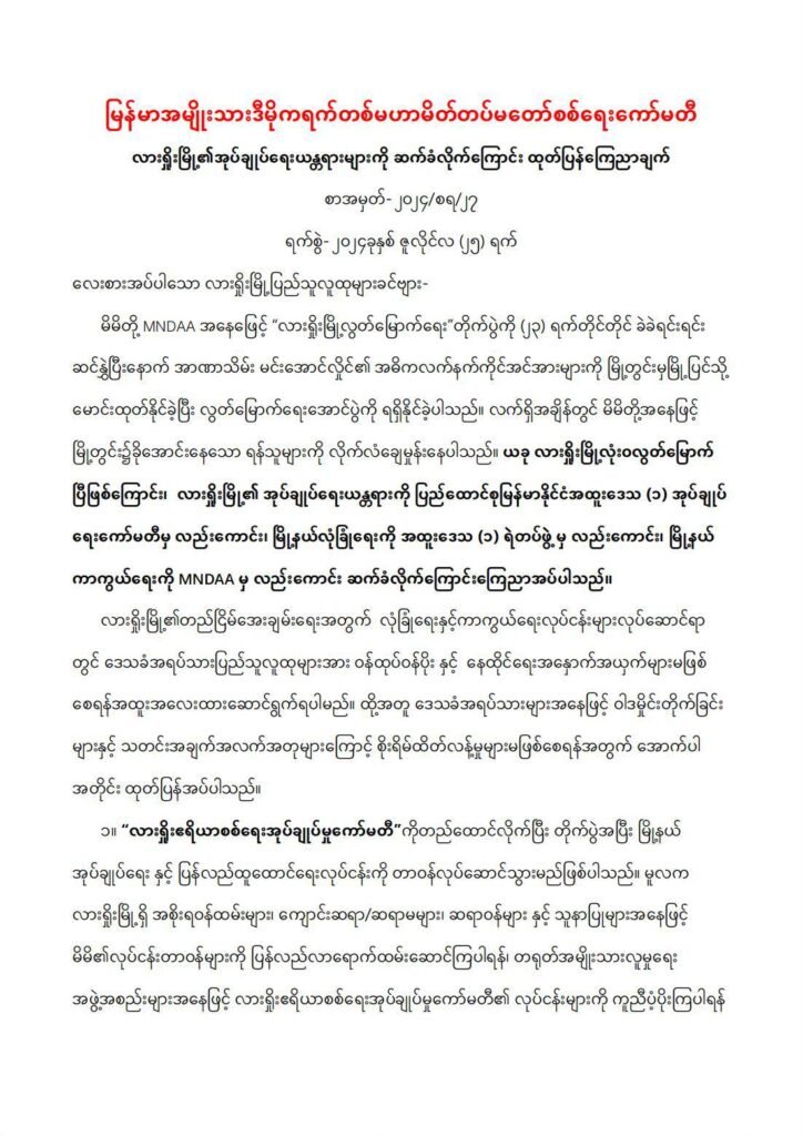 ယင်းအပြင် MNDAA က လားရှိုးမြို့အတွက် အုပ်ချုပ်ရေးအသီးသီးကို ဖွဲ့စည်းထားပြီး လုံခြုံရေးနှင့် ကာကွယ်ရေး လုပ်ငန်းများ ဆောင်ရွက်နေချိန် ဒေသခံအရပ်သားပြည်သူလူထုများအား ဝန်ထုပ်ဝန်ပိုး၊ နေထိုင်ရေးအနှောက်အယှက်များ မဖြစ်စေရန် အထူးအလေးထားဆောင်ရွက်ရမည်ဟု ၎င်းတို့တပ်ဖွဲ့ဝင်များနှင့် အုပ်ချုပ်ရေးအဖွဲ့သီးသီးကို ညွှန်ကြား ထုတ်ပြန်ထားသည်။