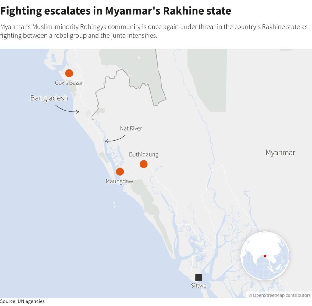 ရခိုင်ပြည် ဘူးသီးတောင်၊ မောင်တော ဒေသမှာ အာရက္ခတပ်တော် AA ကို အင်အား ၁,၀၀၀ ခန့်ဖြင့် စစ်ကောင်စီနှင့် ပူးပေါင်းကာ တိုက်ခိုက်ခဲ့ဟု မွတ်ဆလင် လက်နက်ကိုင်အဖွဲ့တစ်ခုဖြစ်သည့် RSO နိုင်ငံရေးဌာနက ပြောသည်။