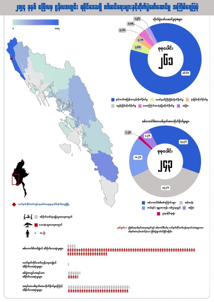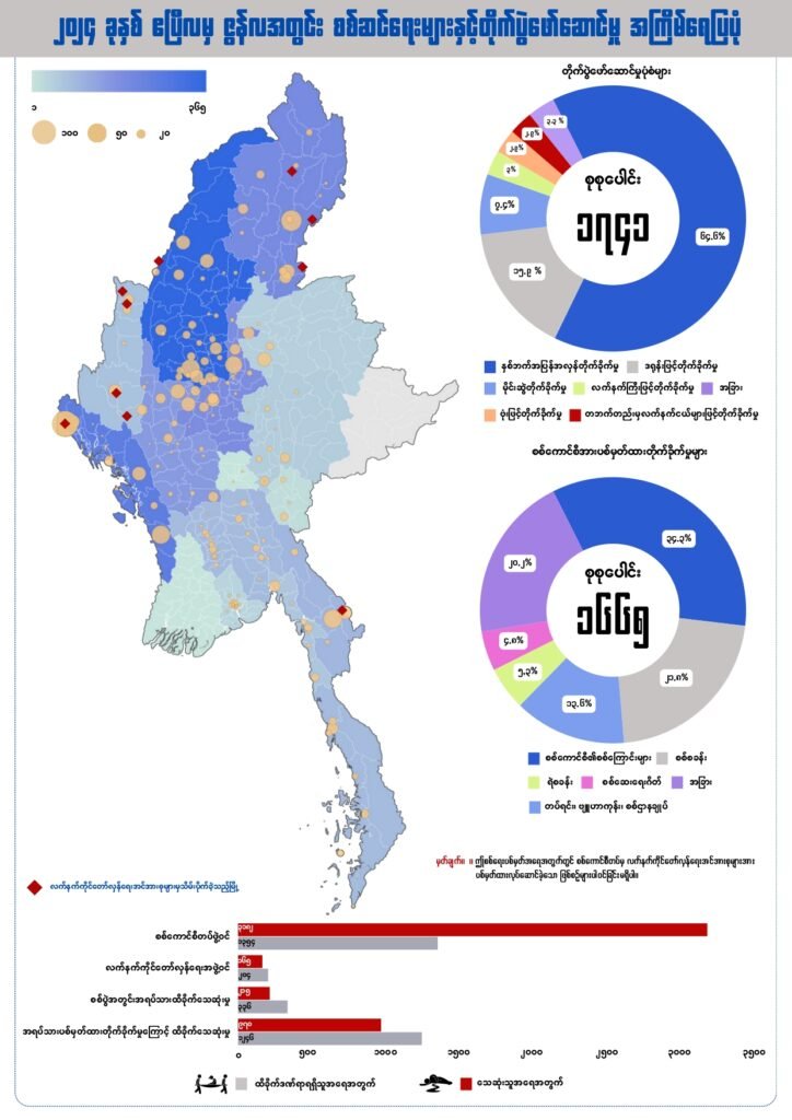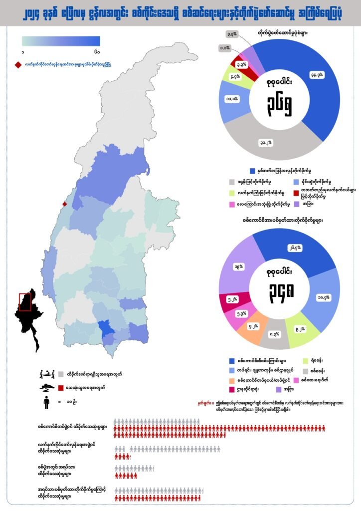 အဆိုပါ ၃ လတာ ကာလအတွင်း ဖြစ်ပွားခဲ့သော စစ်ဆင်ရေးများ၊ တိုက်ပွဲဖော်ဆောင်မှုများနှင့် အရပ်သားထိခိုက်သေဆုံးမှုများကို အသေးစိတ်ကို ဖော်ပြပါပုံများတွင် လေ့လာကြည့်ရှုနိုင်သည်။
