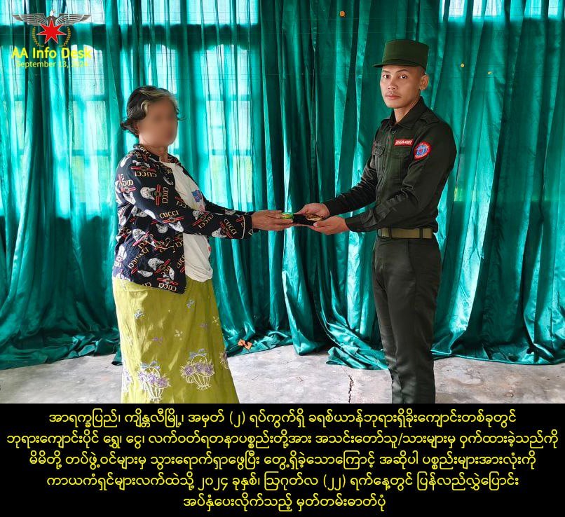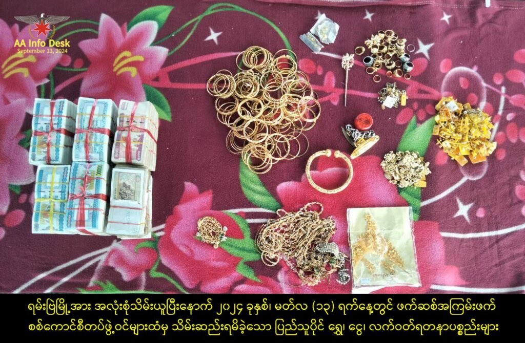 စစ်ရှောင်ပြည်သူများ၏ အဖိုးတန်ပစ္စည်းများဖြစ်သော ရွှေ၊ ငွေ၊ လက်ဝတ်ရတနာများနှင့် ဆိုင်ကယ်၊ ကား စသည့် ပစ္စည်းများ ယူထားသော တပ်ဖွဲ့ဝင်များနှင့် အုပ်ချုပ်ရေးဝန်ထမ်းများကို အရေးယူအပြစ်ပေးသွားမည်ဟု AA က ထုတ်ပြန်ထားသည်။