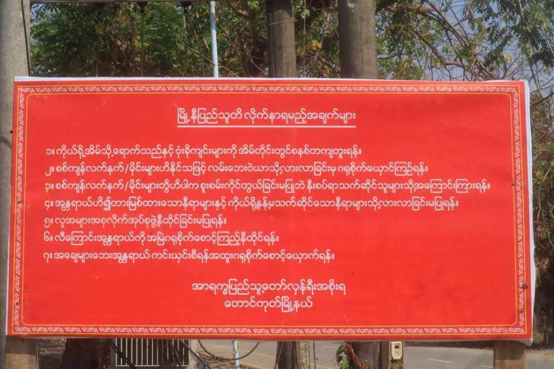 ပြည်သူများ ဘေးကင်းလုံခြုံရေးအတွက် အာရက္ခတပ်တော် AA က မြို့ထဲတွင် သတိပေးဆိုင်းဘုတ်များ၊ စည်းကမ်းချက်များ ဗီနိုင်းများဖြင့် ကပ်ထားကြောင်းလည်း သိရသည်။