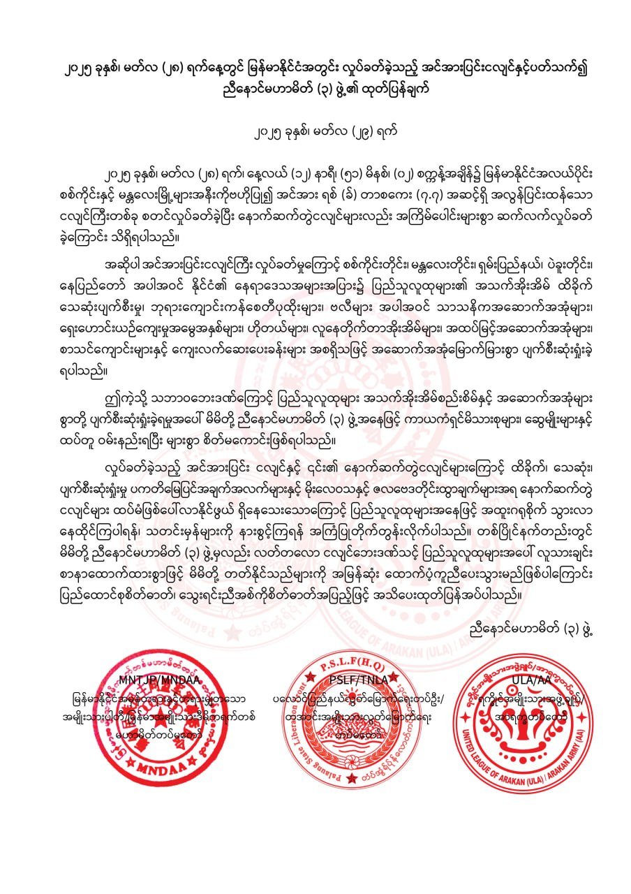 “သဘာဝဘေးဒဏ်ကြောင့် ပြည်သူလူထုများ အသက်အိုးအိမ်စည်းစိမ်နှင့် အဆောက်အအုံများ စွာတို့ ပျက်စီးဆုံးရှုံးခဲ့ရမှုအပေါ် မိမိတို့ ညီနောင်မဟာမိတ် (၃) ဖွဲ့အနေဖြင့် ကာယကံရှင်မိသားစုများ၊ ဆွေမျိုးများနှင့် ထပ်တူ ဝမ်းနည်းရပြီး များစွာ စိတ်မကောင်းဖြစ်ရပါသည်” ဟု ထုတ်ပြန်ထားသည်။