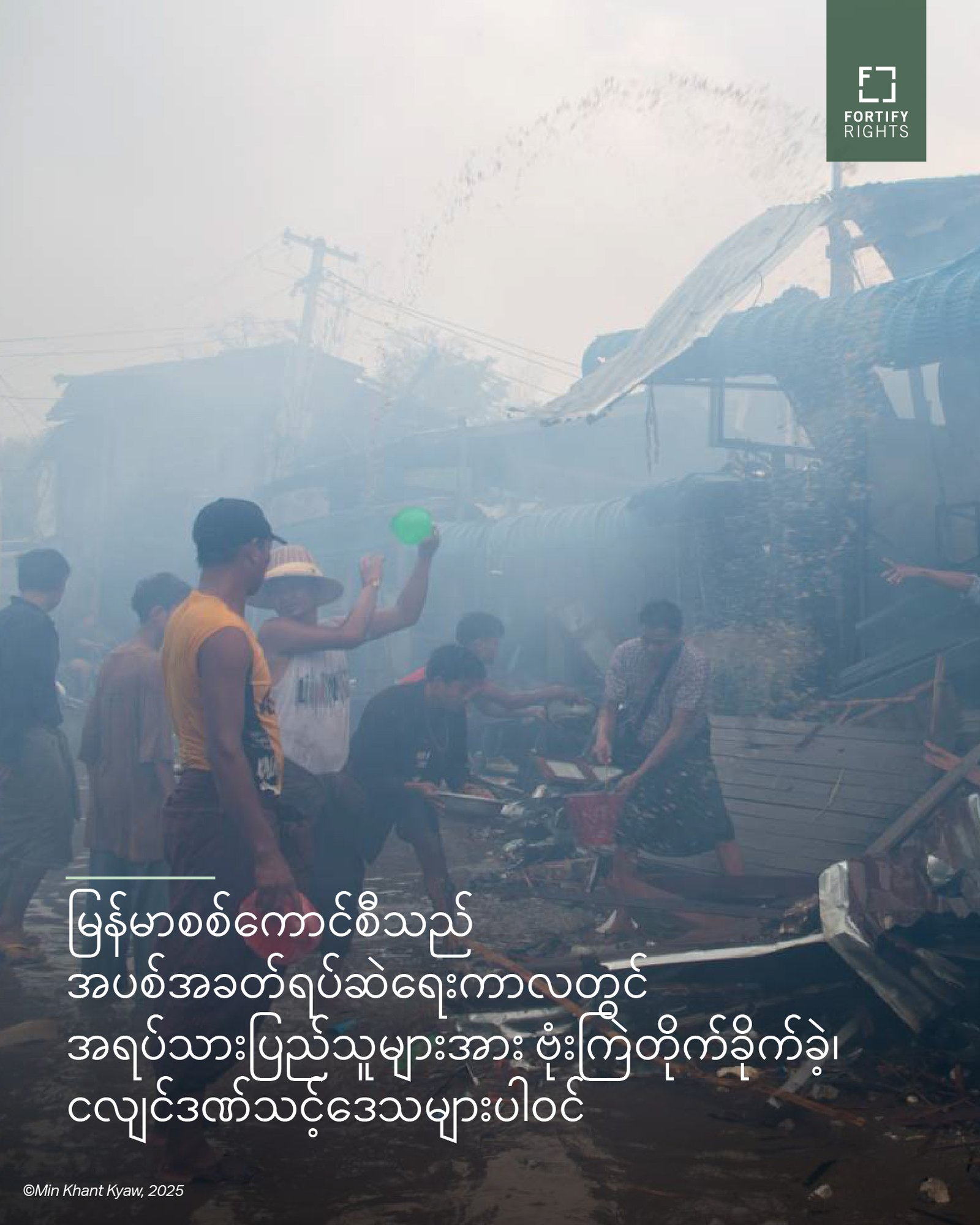 Fortify Rights မှ ကိုစိုင်းအာကာ က “ငလျင်ဘေးအတွင်းမှာ မြန်မာစစ်ကောင်စီအနေနဲ့ အရပ်သားတွေကို ဆက်လက်တိုက်ခိုက်နေတာ ဟာ လုံးဝဥပဒေမဲ့ လုပ်ရပ်တွေပါပဲ။ နိုင်ငံတကာ အသိုင်းအဝိုင်းအနေနဲ့ နောက်ထပ် အသက်တွေ ထပ်မဆုံးရှုံးရခင်မှာ စစ်ကောင်စီရဲ့ လက်နက်နဲ့ လေကြောင်း လောင်စာဆီ ရယူ အသုံးပြုခွင့် ရှိနေတာတွေကို ရပ်တန့်ဖို့ ပြတ်ပြတ်သားသား ဆောင်ရွက်ရပါမယ်” ဟု ပြောသည်။