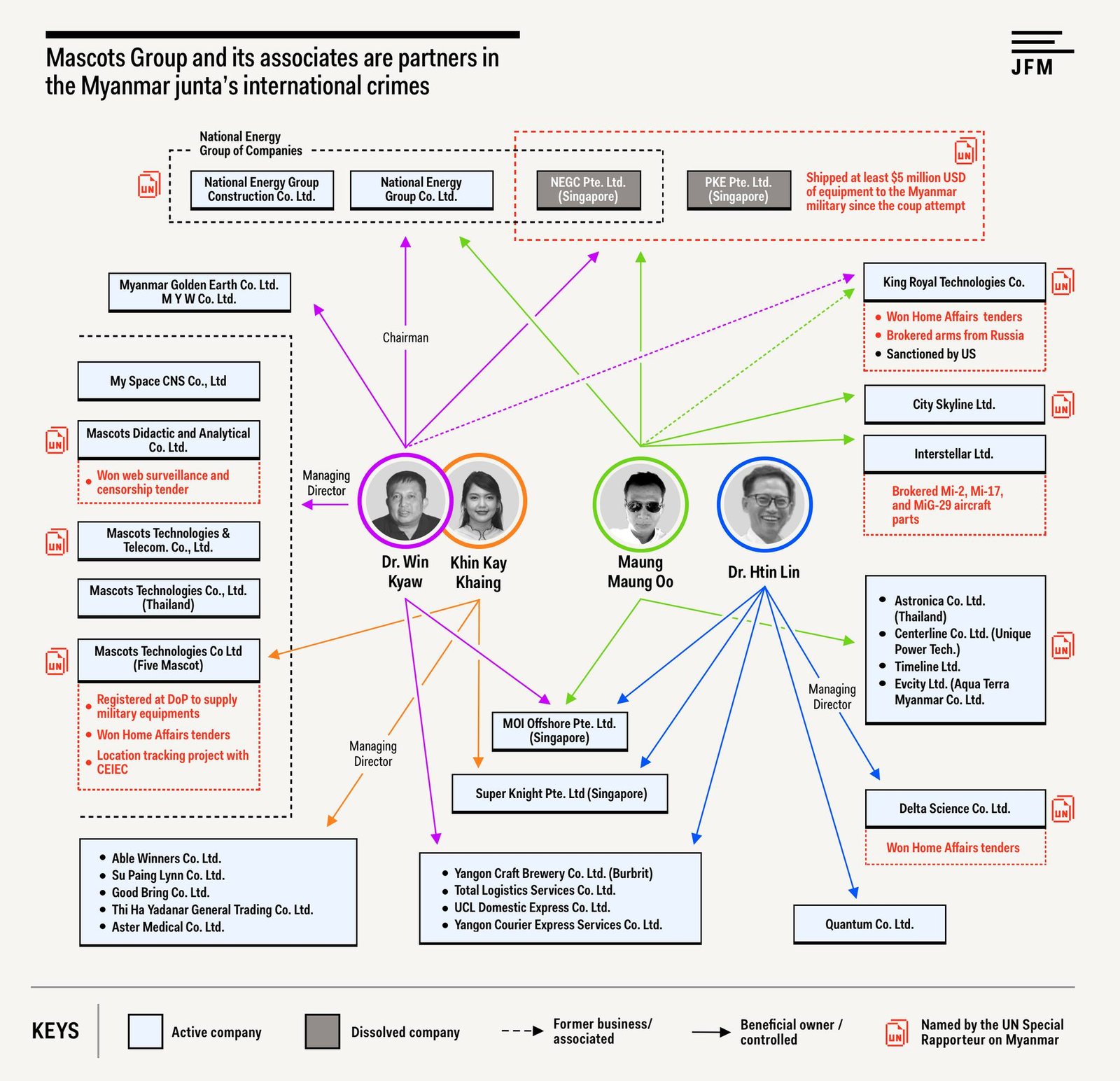 မြန်မာစစ်အုပ်စုအတွက် လက်နက်နှင့်ကိရိယာများကို ကြားခံဝယ်ယူ ပေးသည့် King Royal Technologies ကွန်ရက်၏ တစ်စိတ်တစ်ပိုင်းအဖြစ် မြန်မာနိုင်ငံဆိုင်ရာ ကုလသမဂ္ဂ အထူးကိုယ်စားလှယ်က ဖော်ထုတ်သတ်မှတ်ထားသည့် ကုမ္ပဏီ ၁၈ ခုတွင် Mascots Group စီးပွားရေးကွန်ရက်တွင် ထပ်မံပါဝင်နေသည်။
