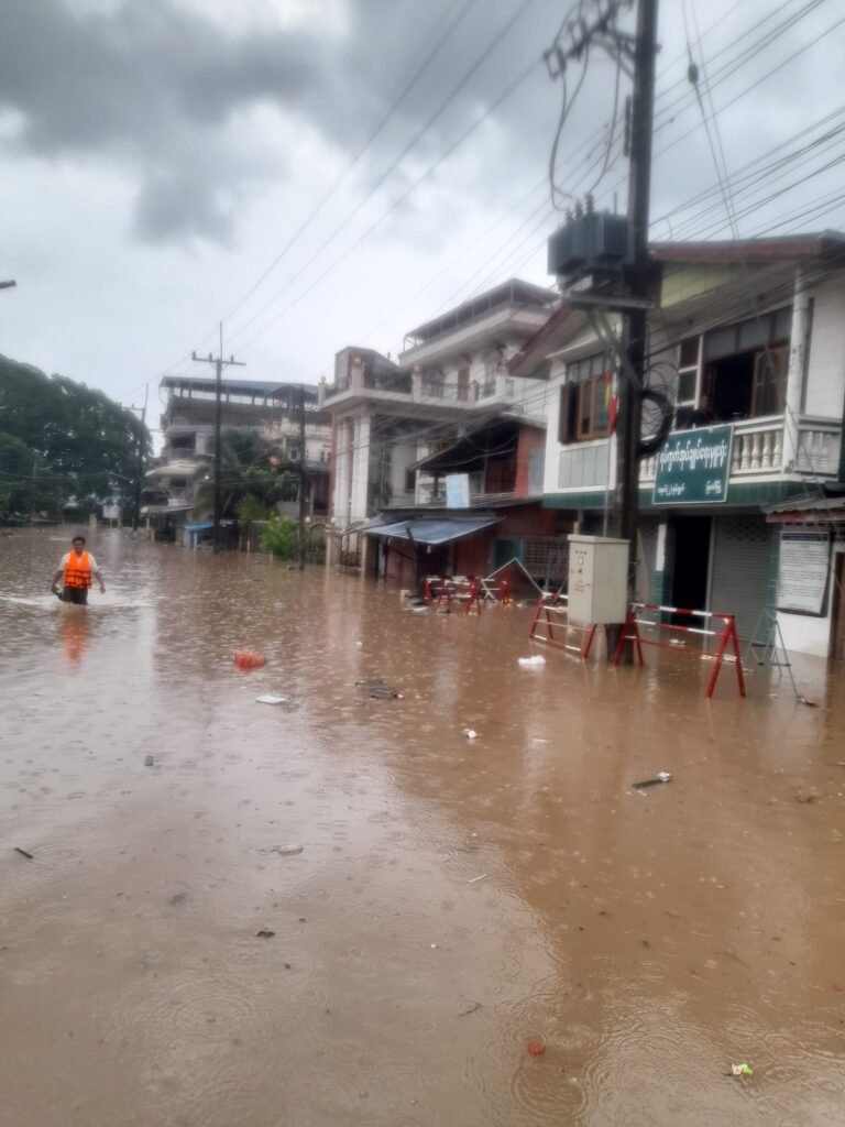 မြဝတီမြို့ထဲ၌ ရပ်ကွက်များအစုသို့ ရေဝင်ရောက်နေ၍ မြို့အခြေအနေကို ဒေသခံ ကိုညီဝင်းခိုင်က ယခုလိုပြောသည်။