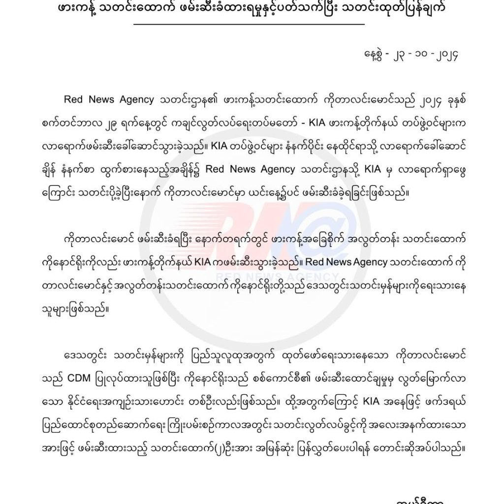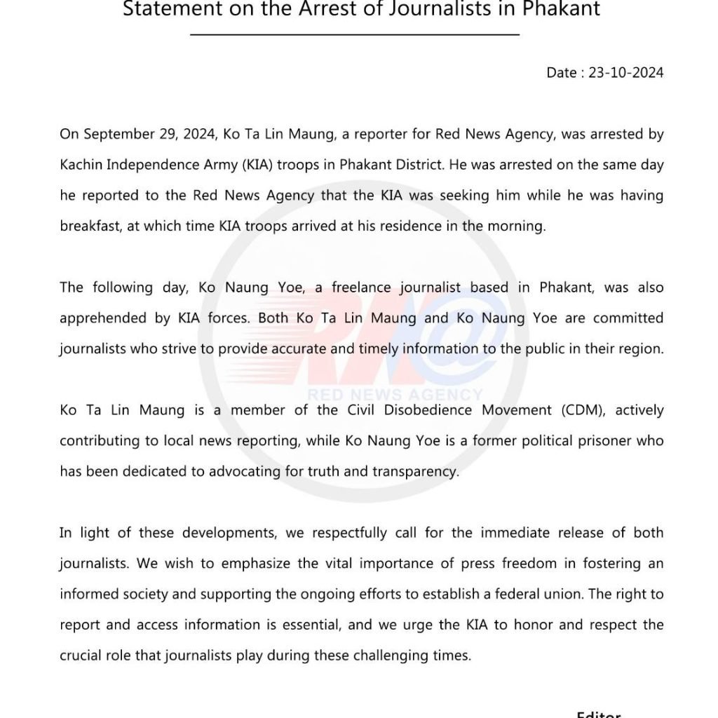 ကချင်လွတ်မြောက်ရေးတပ်မတော် KIA က ဖမ်းဆီးထားသည့် ဖားကန့်မြို့နယ်အခြေစိုက် သတင်းထောက်နှစ်ဦးနှင့် ပတ်သက်၍ Red News Agency ၏ ထုတ်ပြန်ချက်