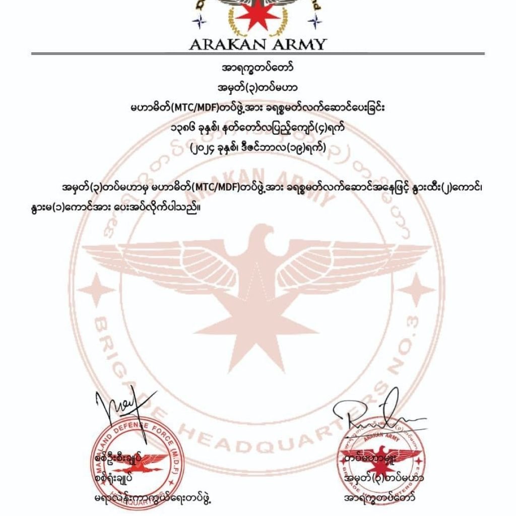 မရာလူမျိုးလွတ်မြောက်ရေးအတွက် တိုက်ပွဲဝင်နေကြသော မရာလဲန်းကာကွယ်ရေးတပ်ဖွဲ့ MTC/MDF ကို အာရက္ခတပ်တော် AA က ခရစ်စ္စမတ် လက်ဆောင်အဖြစ် နွားသုံးကောင်း ပေးအပ်ကြောင်း ဒီဇင်ဘာ ၁၉ ရက်က ထုတ်ပြန်ထားသည်။
