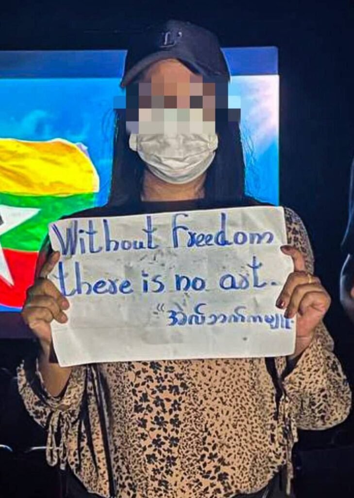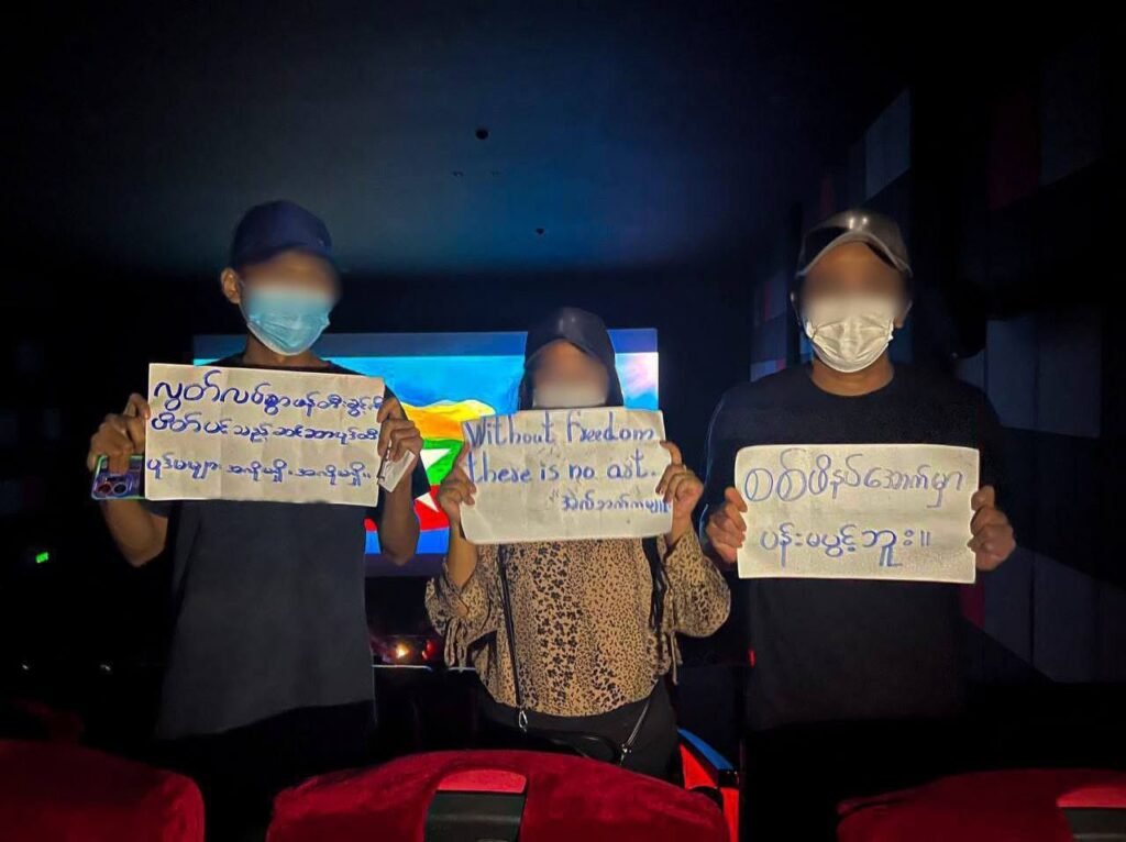 အဆိုပါ ဆန္ဒပြမှုတွင် “လွတ်လပ်စွာအနုပညာဖန်တီးခွင့်ကို ကန့်သတ်ပိတ်ပင်သည့် ပုဒ်ထီးပုဒ်မများ အလိုမရှိ”၊ “စစ်ဖိနပ်အောက်မှာ ပန်းမပွင့်ဘူး”၊ “Without freedom there is no art” စာတန်းများကိုင်ဆောင်ပြီး ဆန္ဒပြခဲ့ကြခြင်း ဖြစ်ပြီး ရုပ်ရှင်လာကြည့်ကြသည့် ပြည်သူအချို၀န်းရံအားပေးခဲ့ကြခြင်း ဖြစ်ကြောင်း သိရသည်။