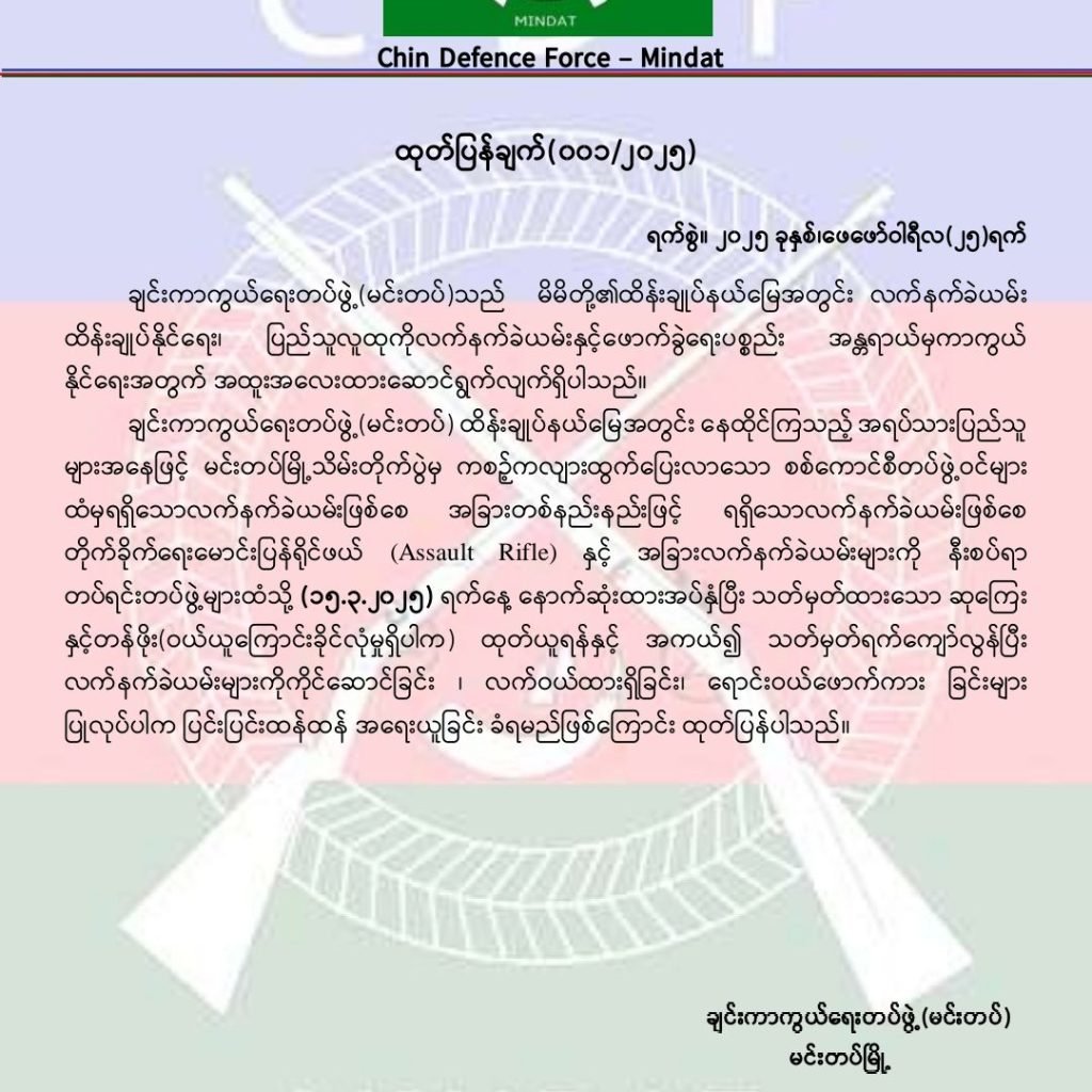 ချင်းပြည်နယ် မင်းတပ်မြို့သိမ်းတိုက်ပွဲမှာ ပြည်သူများအနေဖြင့် စစ်ကောင်စီတပ်ဖွဲ့ဝင်များထံမှ ရရှိထားသည့် လက်နက်နှင့် ခဲယမ်းများကို တပ်ဖွဲ့များထံ ပြန်လည်အပ်နှံကြရန် CDF မင်းတပ်က ဖေဖော်ဝါရီလ ၂၅ ရက်တွင် အသိပေးထုတ်ပြန်ထားသည်။