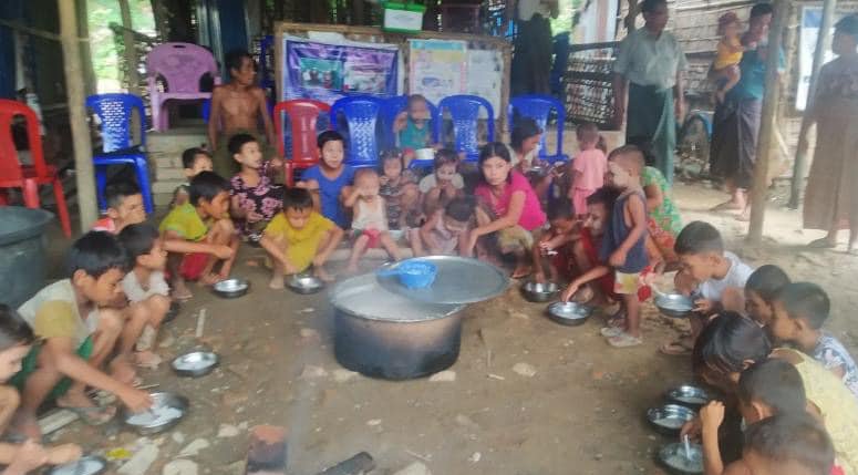 ပုံစာ – ရခိုင်ပြည် မြောက်ဦးမြို့ပေါ်က စစ်ရှောင်များဖြစ်ပြီး ကုန်ဈေးနှုန်း အလွန့်အလွန် မြင့်တက်နေခြင်းကြောင့် ထမင်းနပ်မမှန်တော့ဘဲ ဆန်ပြုတ်ကြိုသောက်နေကြရသည့် စစ်ရှောင်ကလေးငယ်များ။ (ဓါတ်ပုံ – CJ)